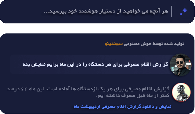 هر وقت بخوای فقط بپرس! سهندینو در لحظه موجودی انبار، وضعیت دستگاهها و سفارشها رو بهت میگه و حتی پیشنهادهای هوشمند برای مدیریت بهتر میده